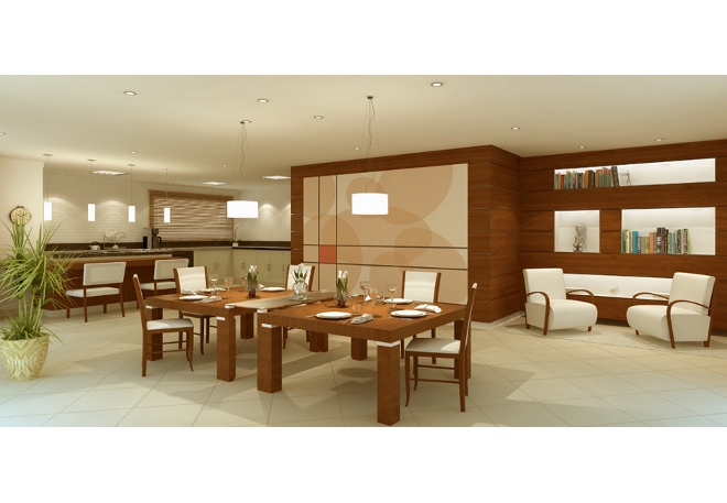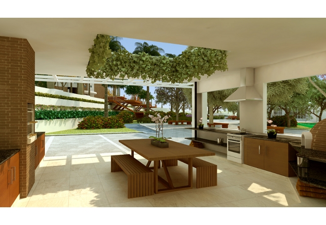* Salão de festas com churrasqueira dotada de sacada e portas-balcão + dispensa + wc